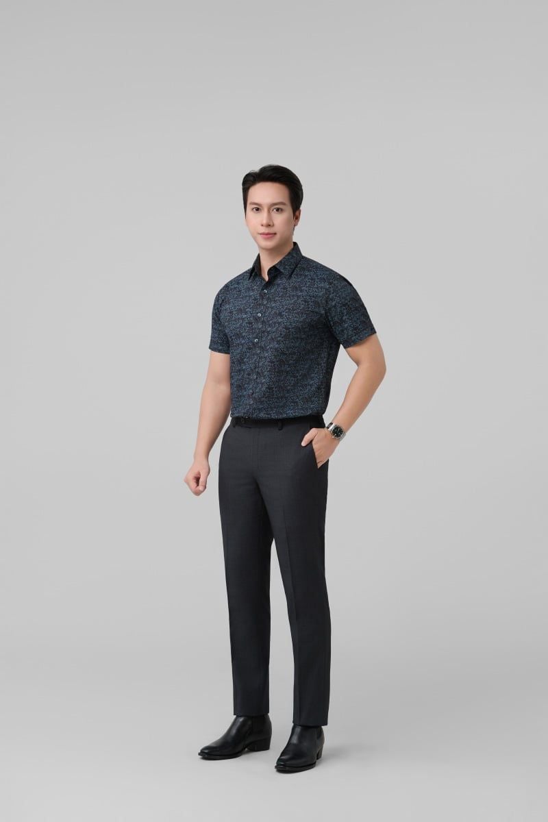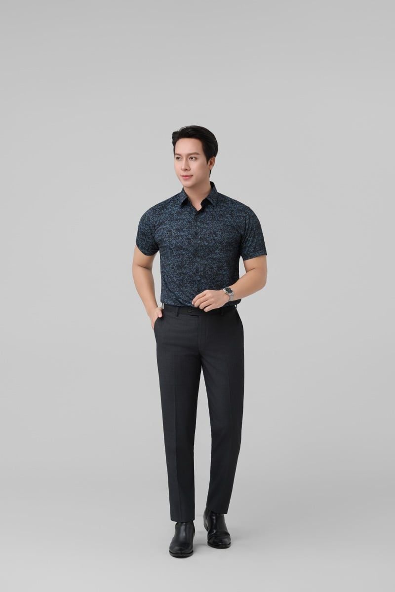 Áo sơ mi nam hoạ tiết Merriman mã THMCS266 ngắn tay màu BLACK